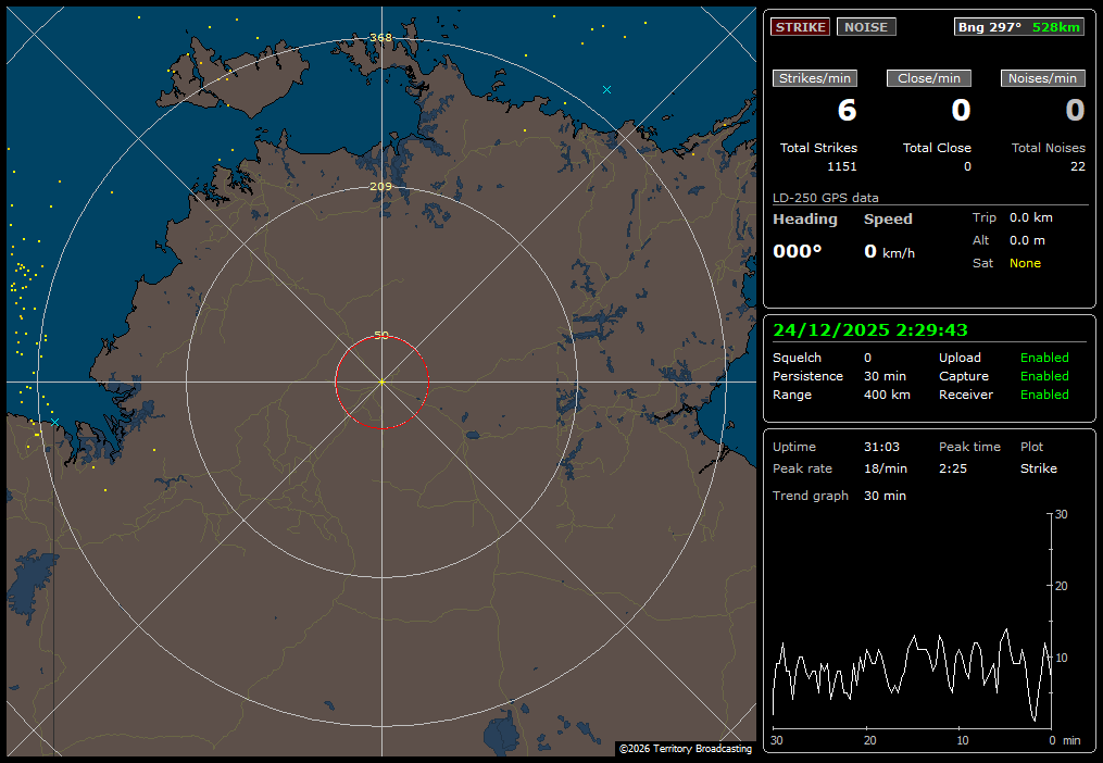 Important Disclaimer: This is an experimental personal Lghtning Detection system. No accuracy is implied or should be assumed. It is an indication of what is happening and approximate bearings.